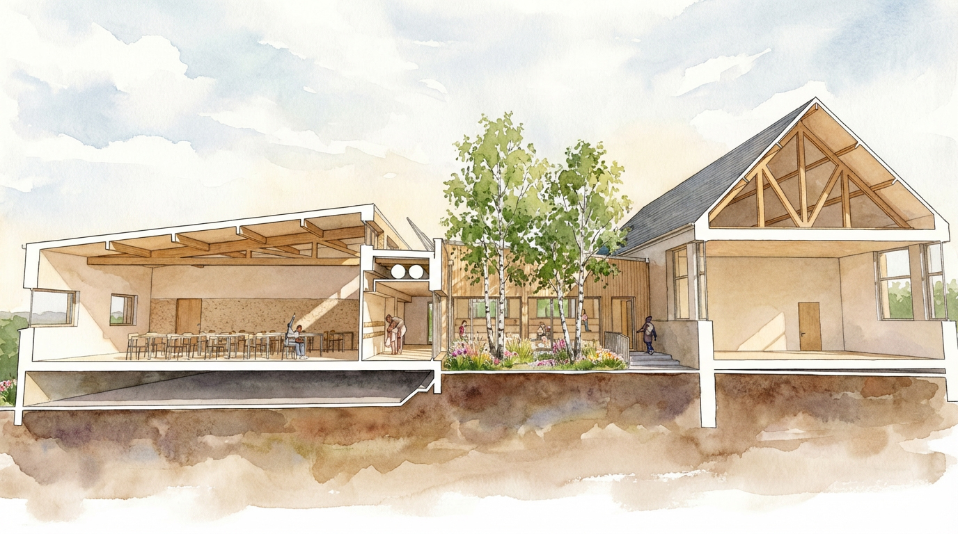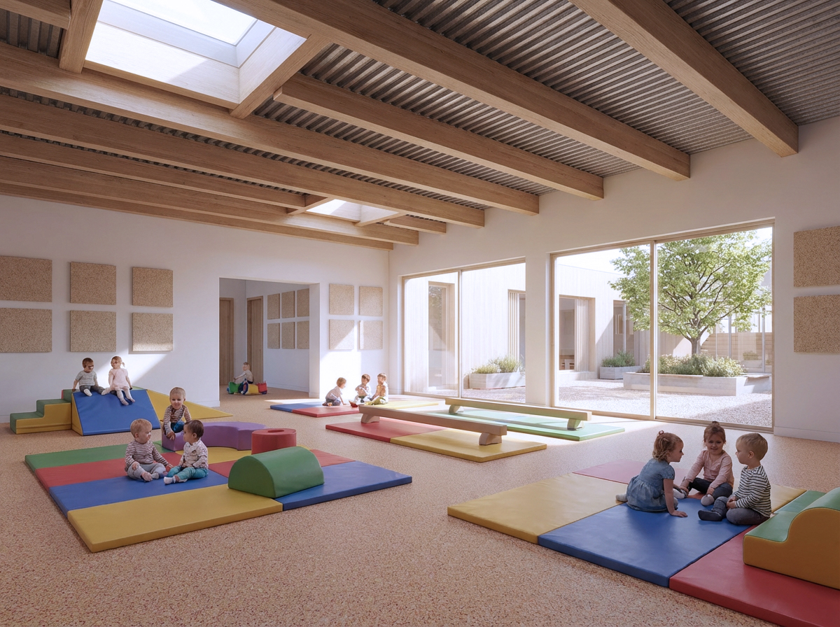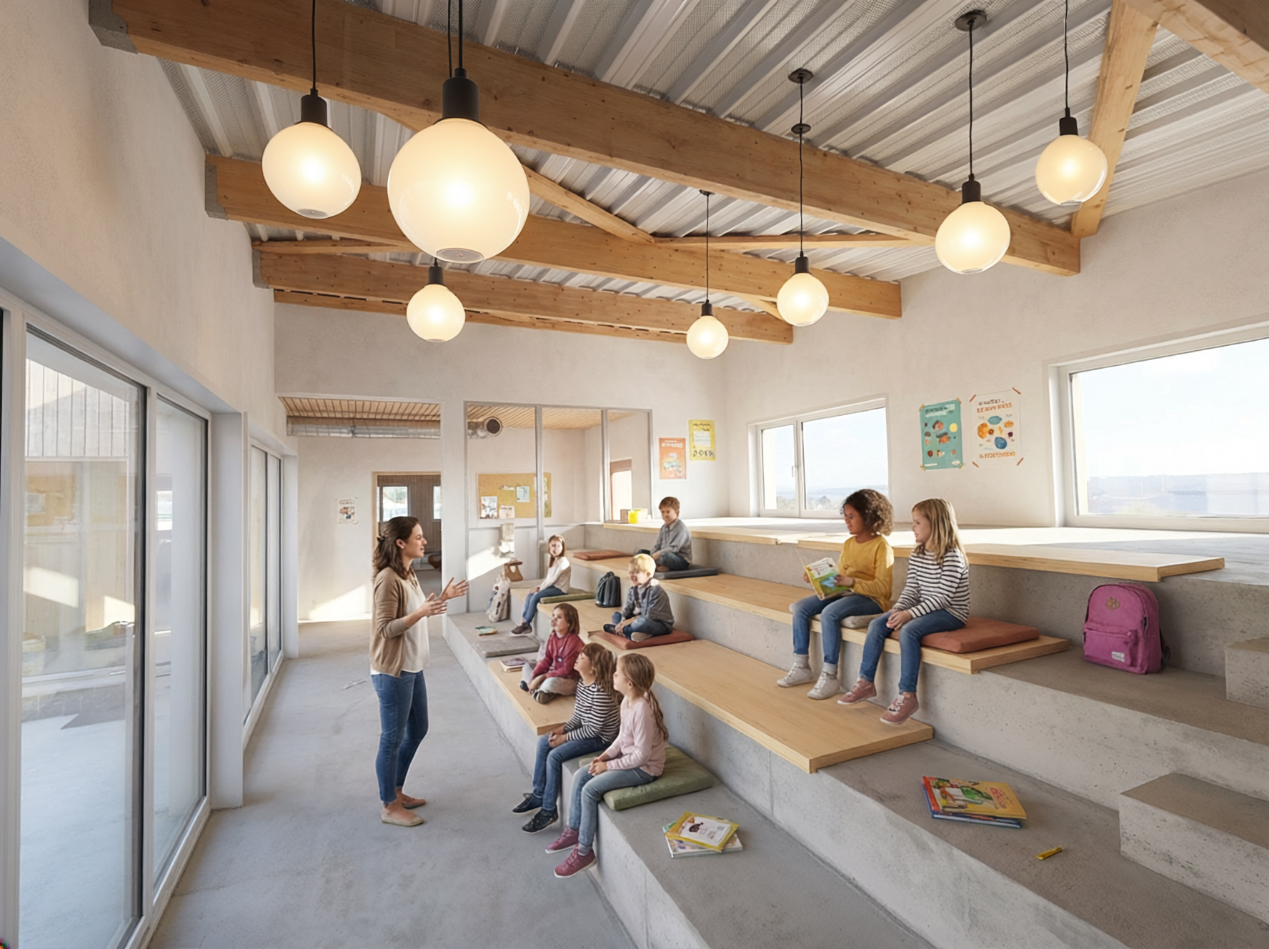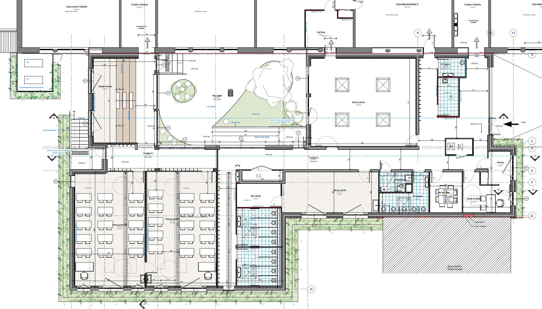 L’extension vient se connecter à l’existant en créant un patio végétal qui permettra de proposer une cour abritée des vents dominants et ne pénalisera pas l’éclairage naturel des classes. Le nouveau programme intègre 2 salles de classes et 2 salles de motricité. Elles laisseront la charpente bois apparente pour apporter une ambiance chaleureuse. Le projet offre également une estrade de lecture avec une vue sur le patio, Cette extension comprendra également une mise en accessibilité aux personnes à mobilités réduites sur l’ensemble de l’école qui formera une unité.